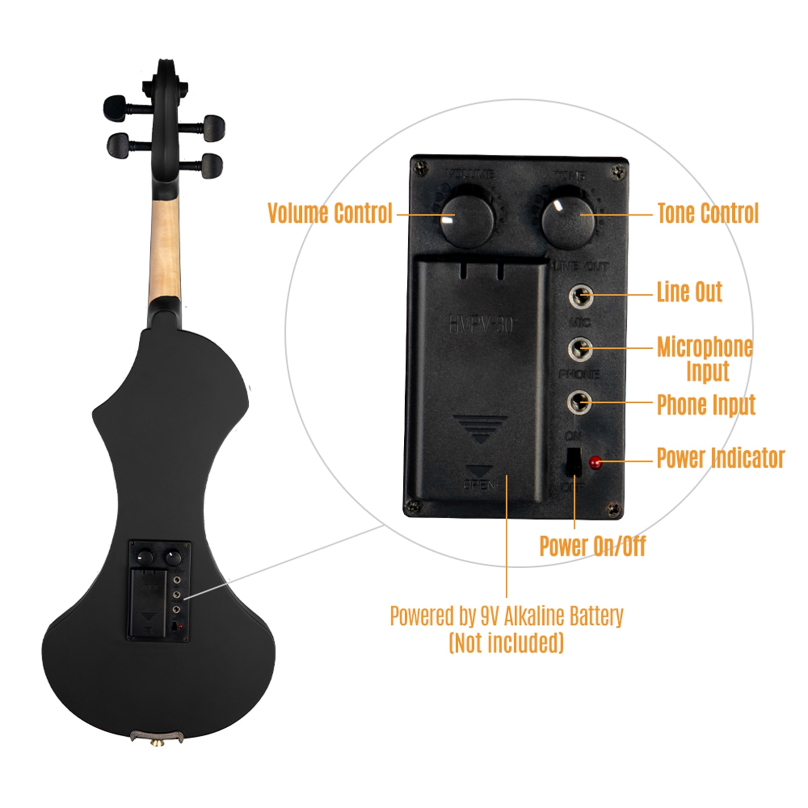 The violin is powered by one piece 9V Alkaline battery, the battery is not included in the package.
